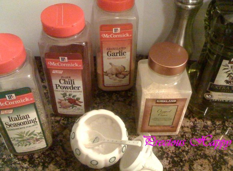 1. Put about 2 lbs of fresh catfish fillets in a large bowl. Add seasonings (sea-salt, fresh-ground pepper, granulated garlic, dark chili powder–I used the non-spicy kind but you can substitute the spicy kind if you like your fish with a bite, dried chopped onion, and Italian herb seasoning mix)
